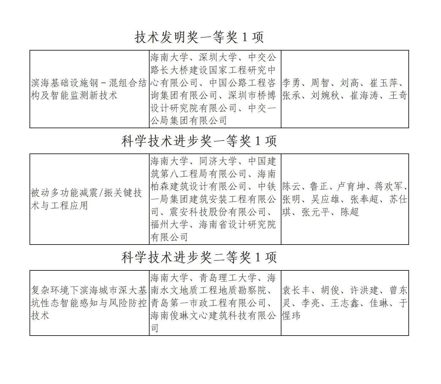 12月5日,海南省科学技术奖励大会在海口隆重举行,一批为海南科技进步做出突出贡献的科技工作者接受表彰。公司作为第一完成单位获海南省技术发明奖一等奖1项、海南省科学技术进步奖一等奖1项和二等奖1项。周智教授(排名第二)及团队完成的《滨海基础设施钢-混组合结构及智能监测新技术》获海南省技术发明奖一等奖;陈云教授(排名第一)等完成的《被动多功能减震/振关键技术与工程应用》获海南省科学技术进步奖一等奖;胡俊教授(排名第二)等完成的《复杂环境下滨海城市深大基坑性态智能感知与风险防控技术》获科学技术进步奖二等奖。