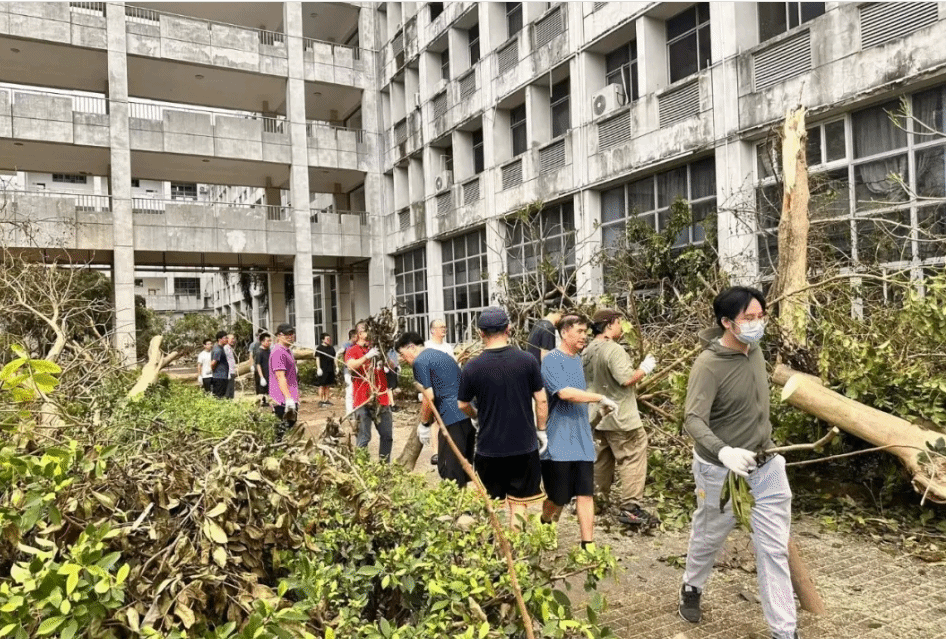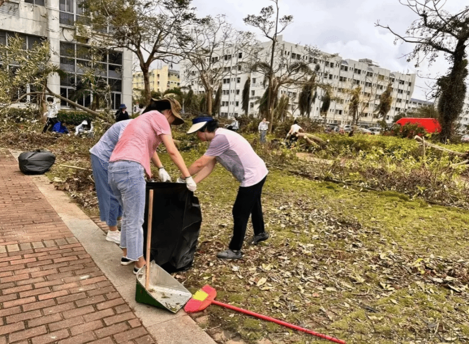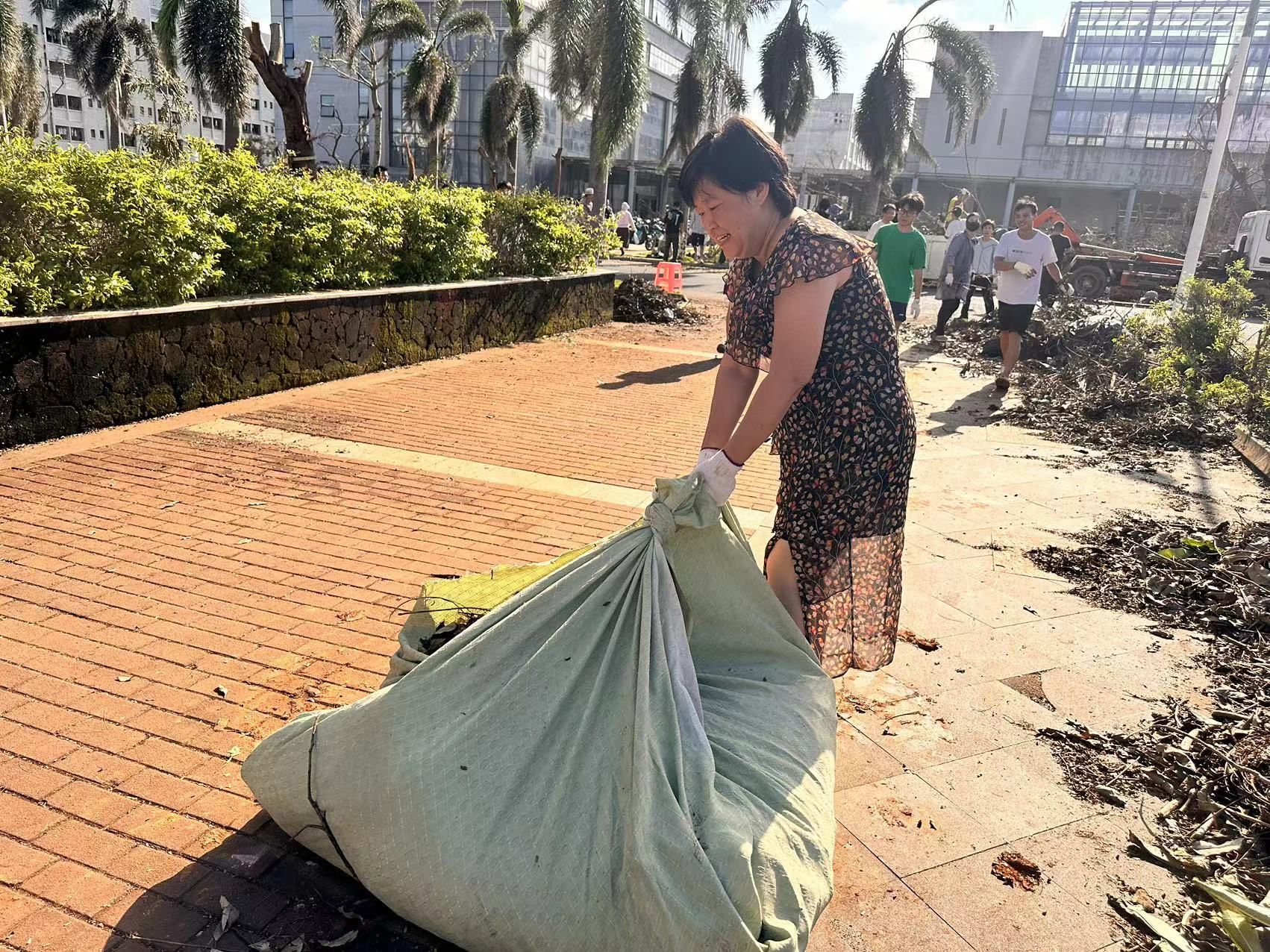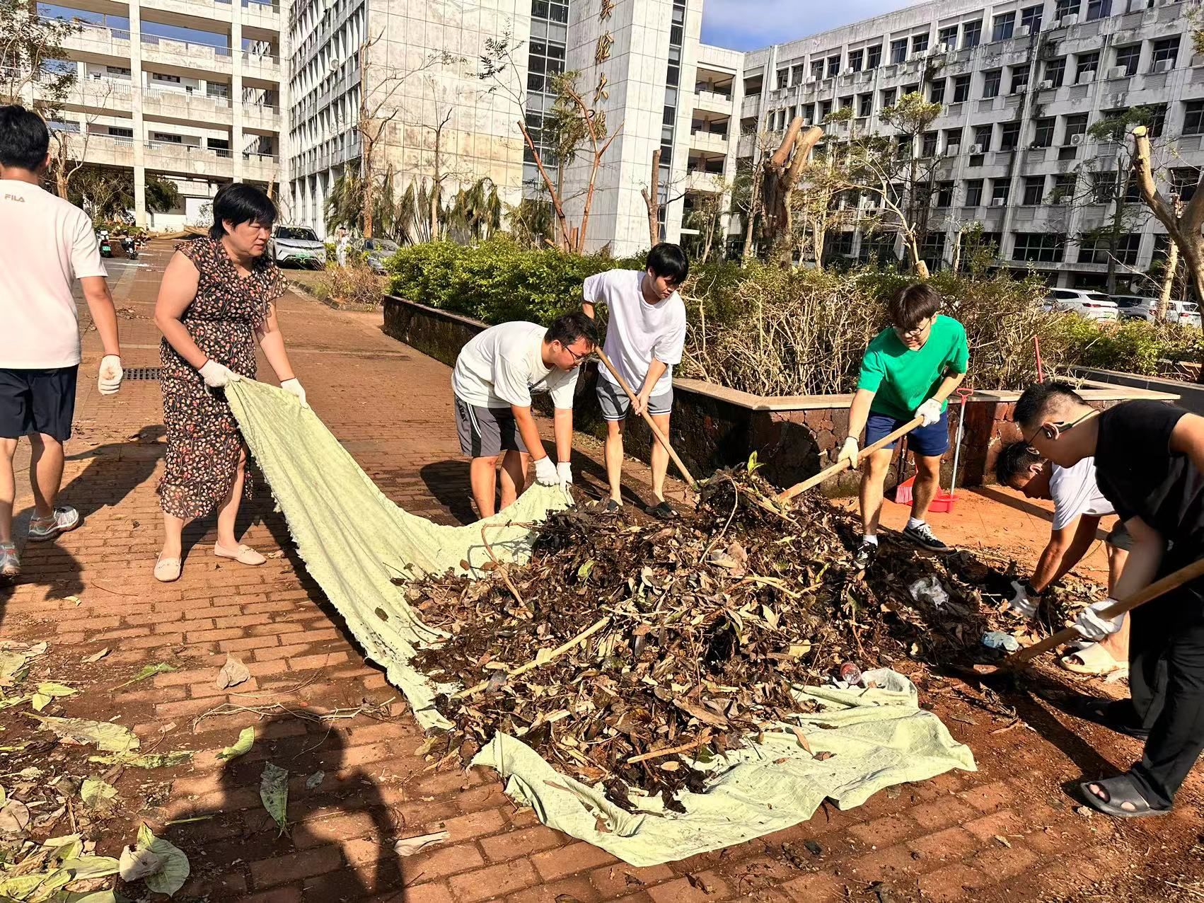 9月12日,椰风书院的2024级新生也加入公司救灾队伍。这些十八九岁的孩子不惧晒,不怕脏,肯吃苦,奋力抬起一根根沉重的断木。这是他们来到海南,来到英国be365官网经历的一次深刻的人生历练,即沉重又厚重。愿他们在英国be365官网未来的学习生活中,不畏困难,不惧挑战,以梦为帆,乘风破浪。