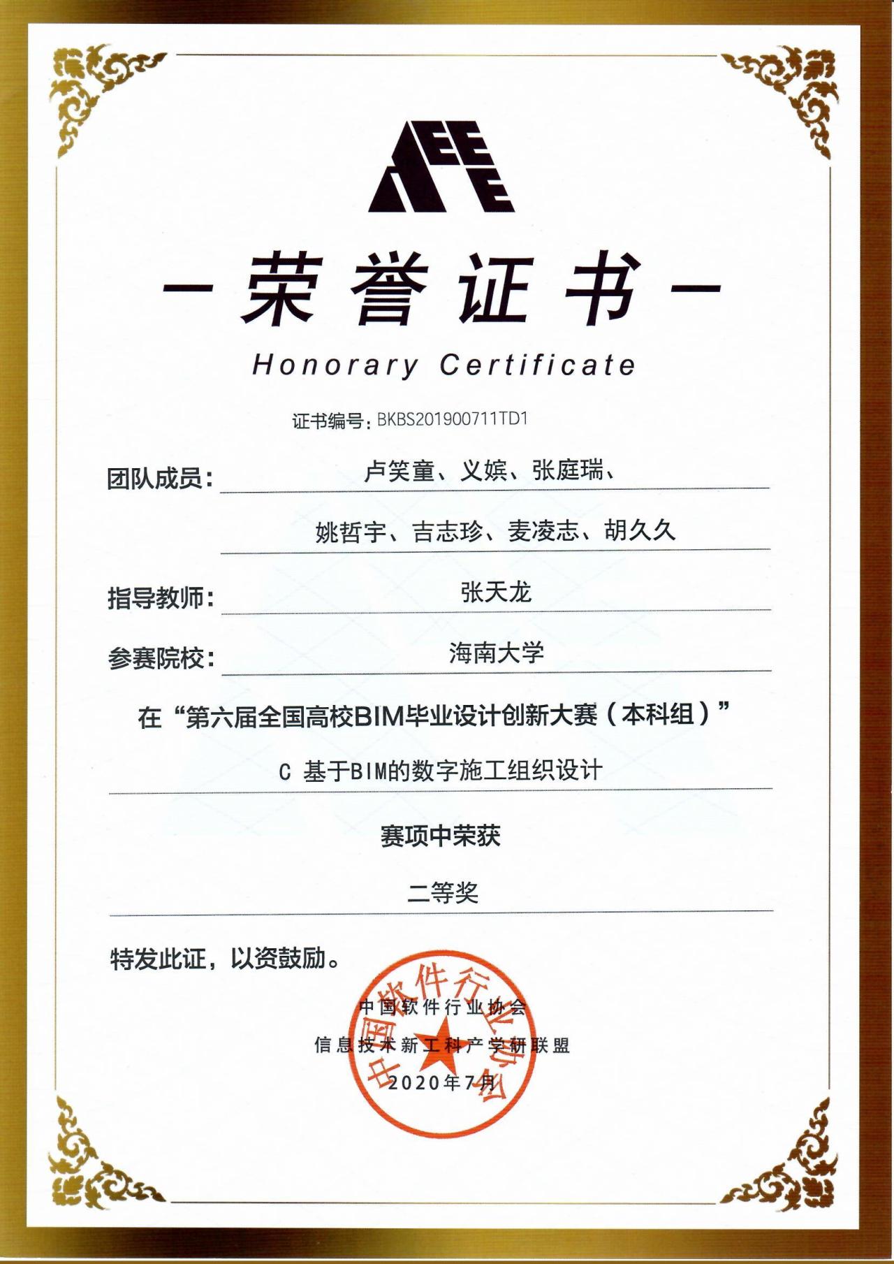 2020年6月16日,第六届全国高校BIM毕业设计创新大赛评选结果揭晓。由英国be365官网工程管理系张天龙老师指导,工程管理2016级毕业生卢笑童、义嫔、张庭瑞、姚哲宇、吉志珍、胡久久、麦凌志、陈浩等组成的参赛团队在“基于BIM的数字施工组织设计”模块中斩获二等奖。
