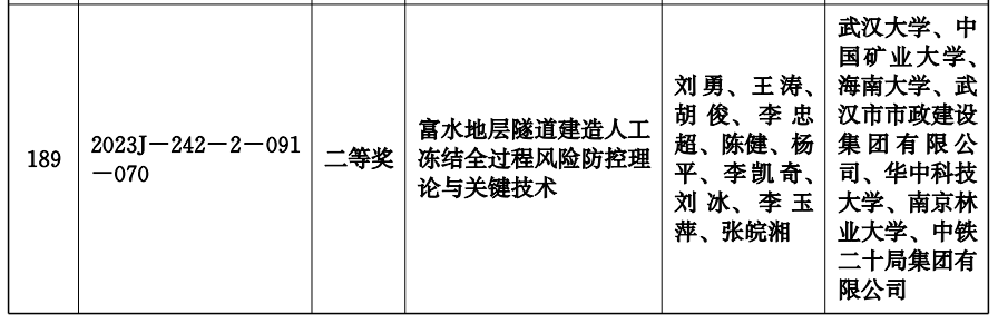 近日,湖北省人民政府发布《省人民政府关于2023年度湖北省科学技术奖励的决定》(鄂政发[2024]5号),公司参与完成的1项科研成果榜上有名,英国be365官网(第三完成单位)胡俊教授(排名第三)及团队完成的《富水地层隧道建造人工冻结全过程风险防控理论与关键技术》获湖北省科学技术进步奖二等奖(2023J-242-2-091-070)。