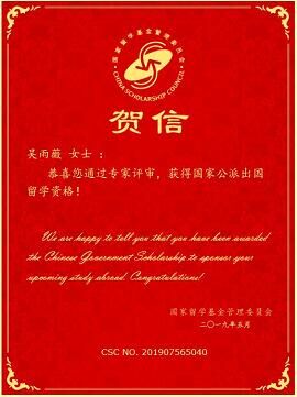 经过国家留学基金委(CSC)评审,2019年度国家公派研究生项目录取结果陆续公布。英国be365官网硕士研究生吴雨薇成功获得国家留学基金委员会资助,将前往日本北海道大学攻读博士研究生学位,这是公司首次获得国家公派博士研究生项目资助,特此祝贺!