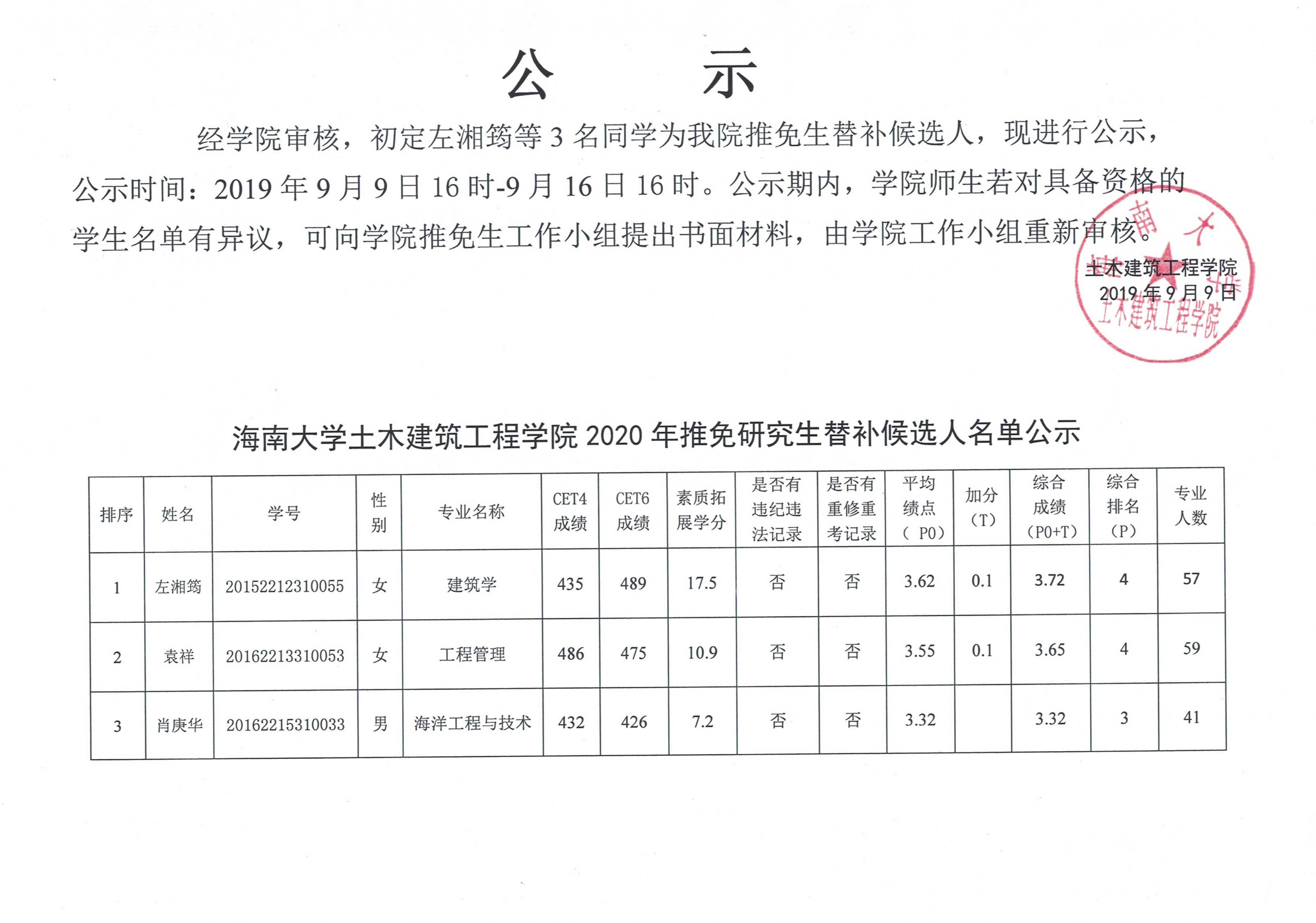 2020年推免研究生替补候选人名单公示