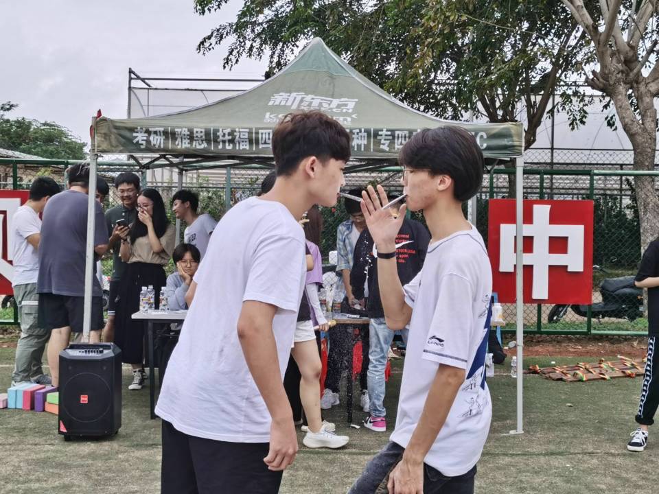 最后一轮游戏是“吹面粉”。这个环节是对团队精神与团队成员自身耐力与责任心的考验。在游戏过程中,不少同学吹起面粉,一时间“千树万树梨花开”,活现场地俨然一副“海南雪景图”。但也有队伍所有成员屏气凝神、面不改色,稳妥地传递着面粉。