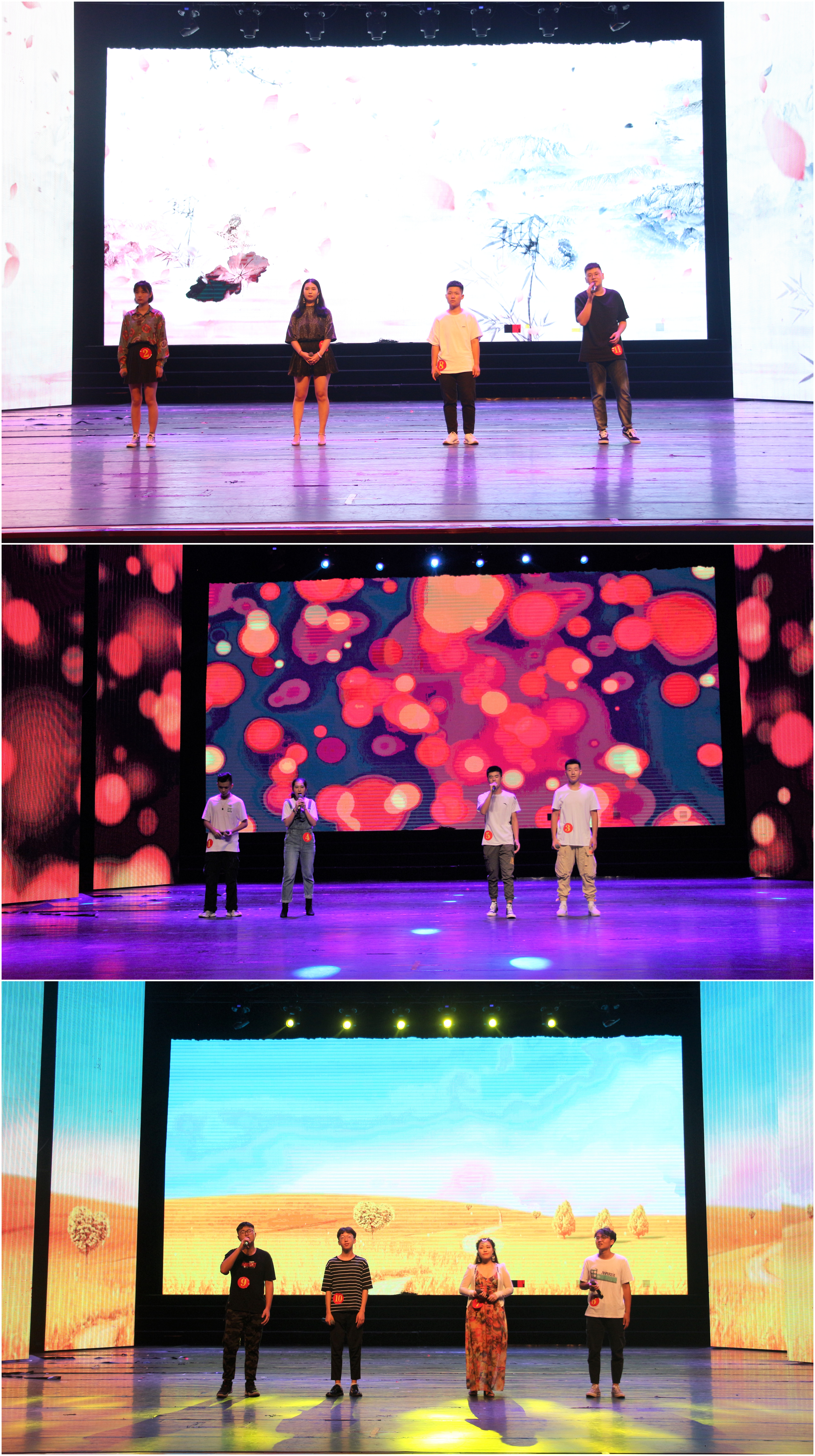 在全场观众期待的目光下,伴随着明快的开场音乐,两位主持人来到舞台中央,比赛拉开帷幕。比赛第一阶段是团队主题秀。李天歌、温冰冰、黄婷、孔凡歌四位选手带来一曲浓厚中国风的《兰亭序》;汤宝怡、杨沛霖、许亮、王俊潼四位选手演绎了一曲“霸气外露”的《残酷月光》;王赢、孙纳勋、彭延俊、黄浩四位选手带来了歌曲《如果有来生》。精彩的开场团队秀为本次比赛开了个好头,观众的掌声和欢呼声一浪高过一浪。