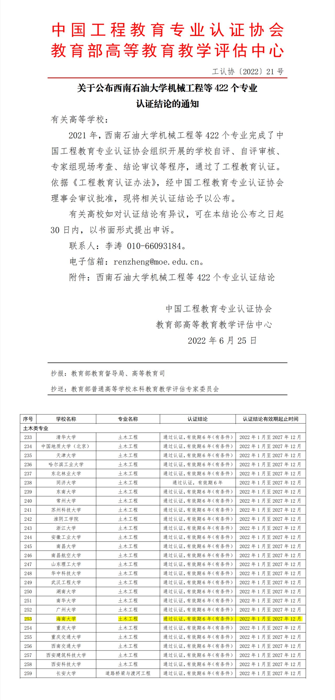 2022年6月25日,中国工程教育专业认证协会、教育部高等公司产品评估中心发布《关于公布西南石油大学机械工程等422个专业认证结论的通知》(工认协[2022]21号)。英国be365官网土木工程专业顺利通过工程教育认证,认证结论为“通过认证,有效期6年(有条件)”,认证结论有效期起止时间为2022年1月至2027年12月。同时通过认证的有清华大学、同济大学和浙江大学等26所高校的土木工程专业。据悉,该名单还将提交至国际工程教育《华盛顿协议》组织。