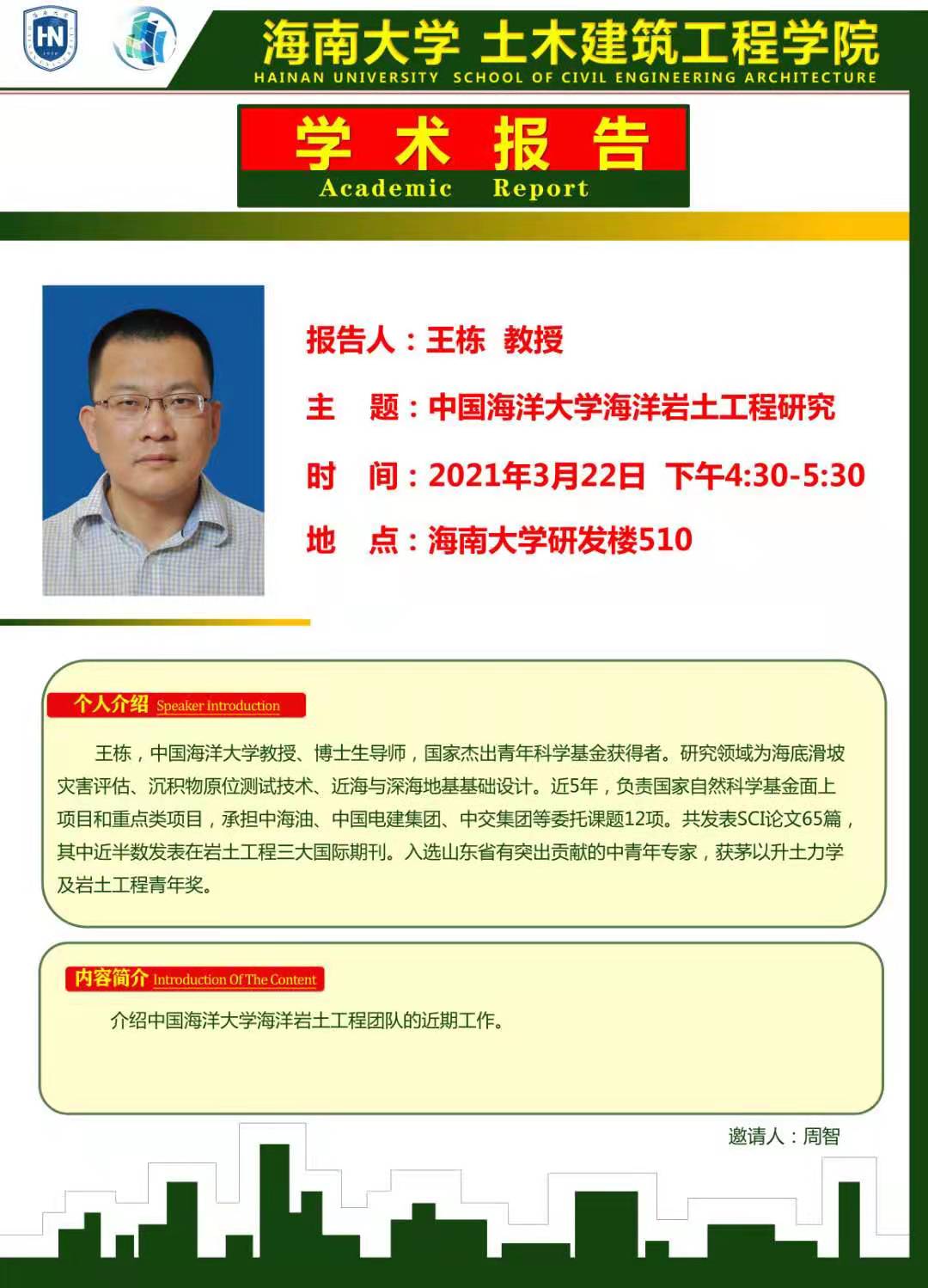 3月22日(周一)下午4:00-5:30点在英国be365官网研发楼510,中国科公司武汉岩土力学研究所,博士生导师汪稔研究员和中国海洋大学王栋教授分别在公司做题为《岛礁建设对“一带一路”倡议的贡献》和《中国海洋大学海洋岩土工程研究》。请有兴趣的老师和没有课的研究生务必参加,到时会做参会签名,考勤记录。特此通知 学科与科研办 2021年 3月21日