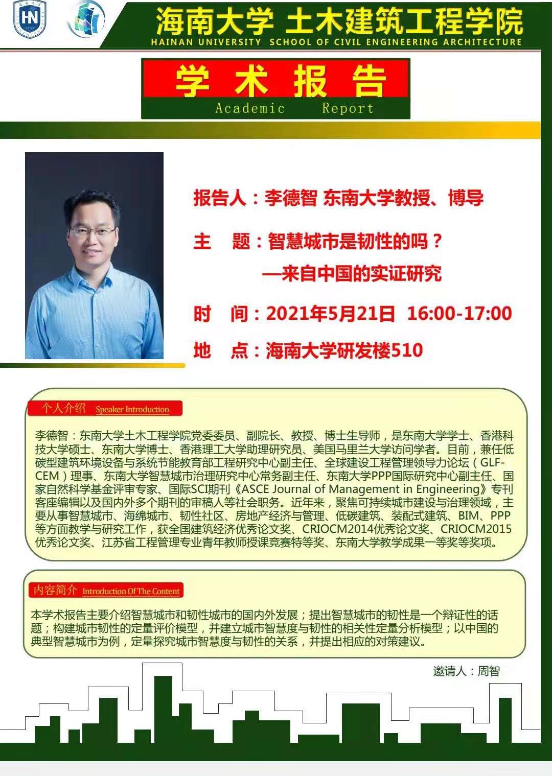 5月21日(周五)16:00-17:00点在英国be365官网研发楼510,东南大学土木工程公司副经理、博士生导师李德智教授在公司做题为《智慧城市是韧性的吗? —来自中国的实证研究》学术报告。欢迎有兴趣的老师和没有课的研究生参加。特此通知