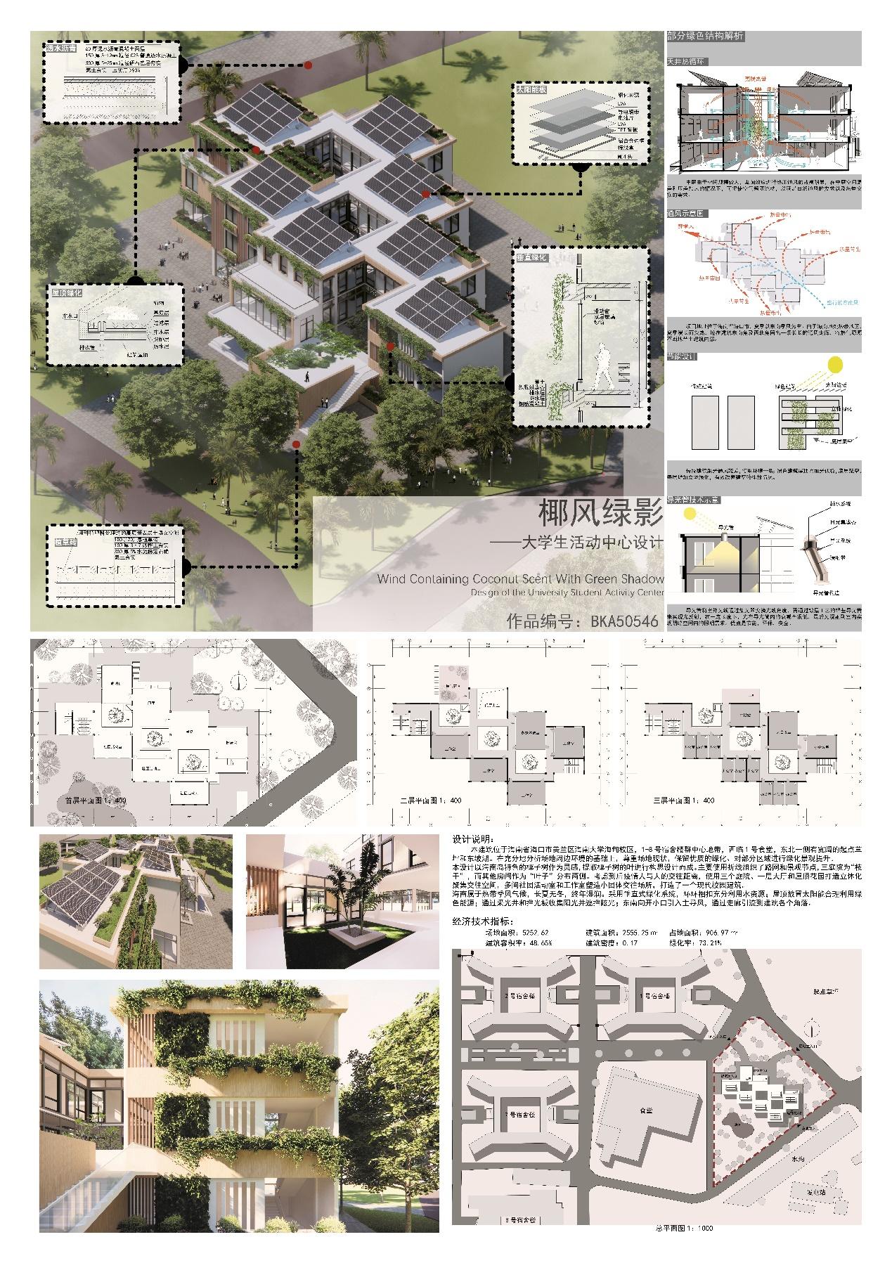 优秀作品奖是椰风绿影——老员工活动中心设计,本建筑位于海南省海口市美兰区英国be365官网海甸校区,1-8号宿舍楼群中心地带,西临1号食堂,东北一侧有宽阔的起点草坪和东坡湖。在充分地分析场地周边环境的基础上,尊重场地现状,保留优质的绿化、对部分区域进行绿化景观提升。