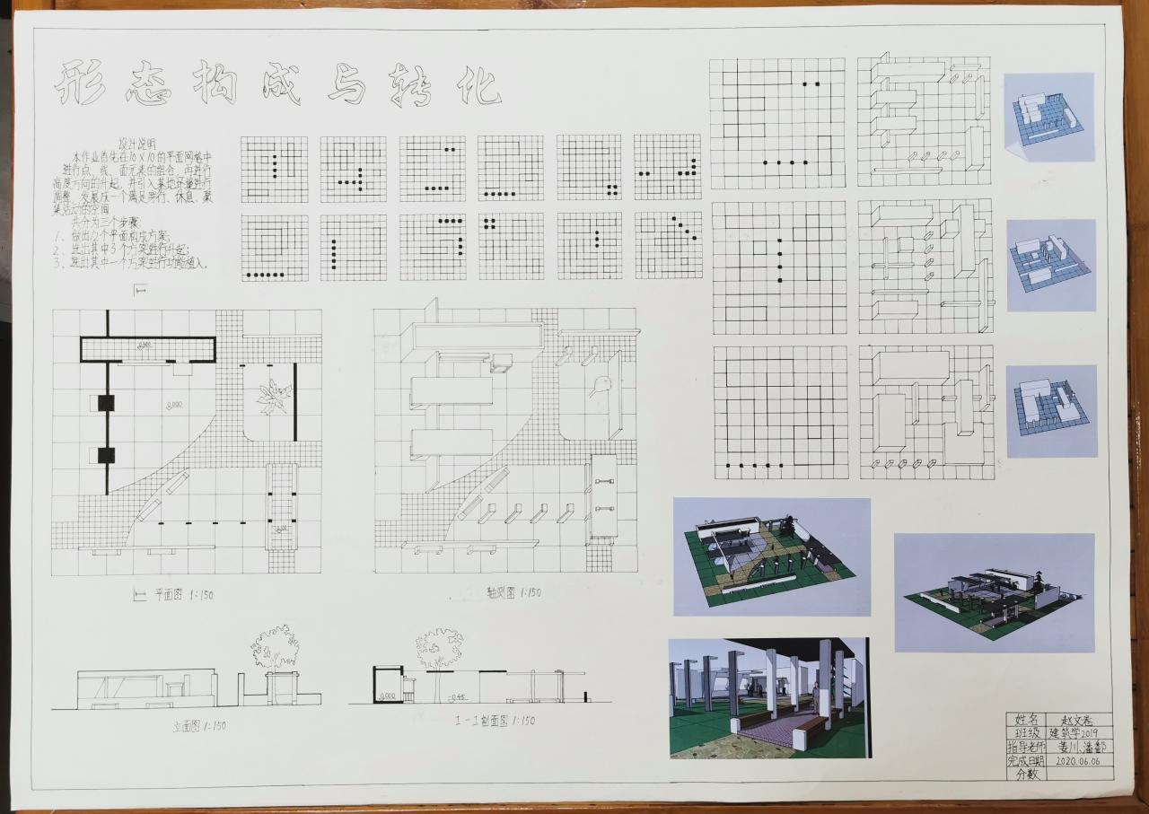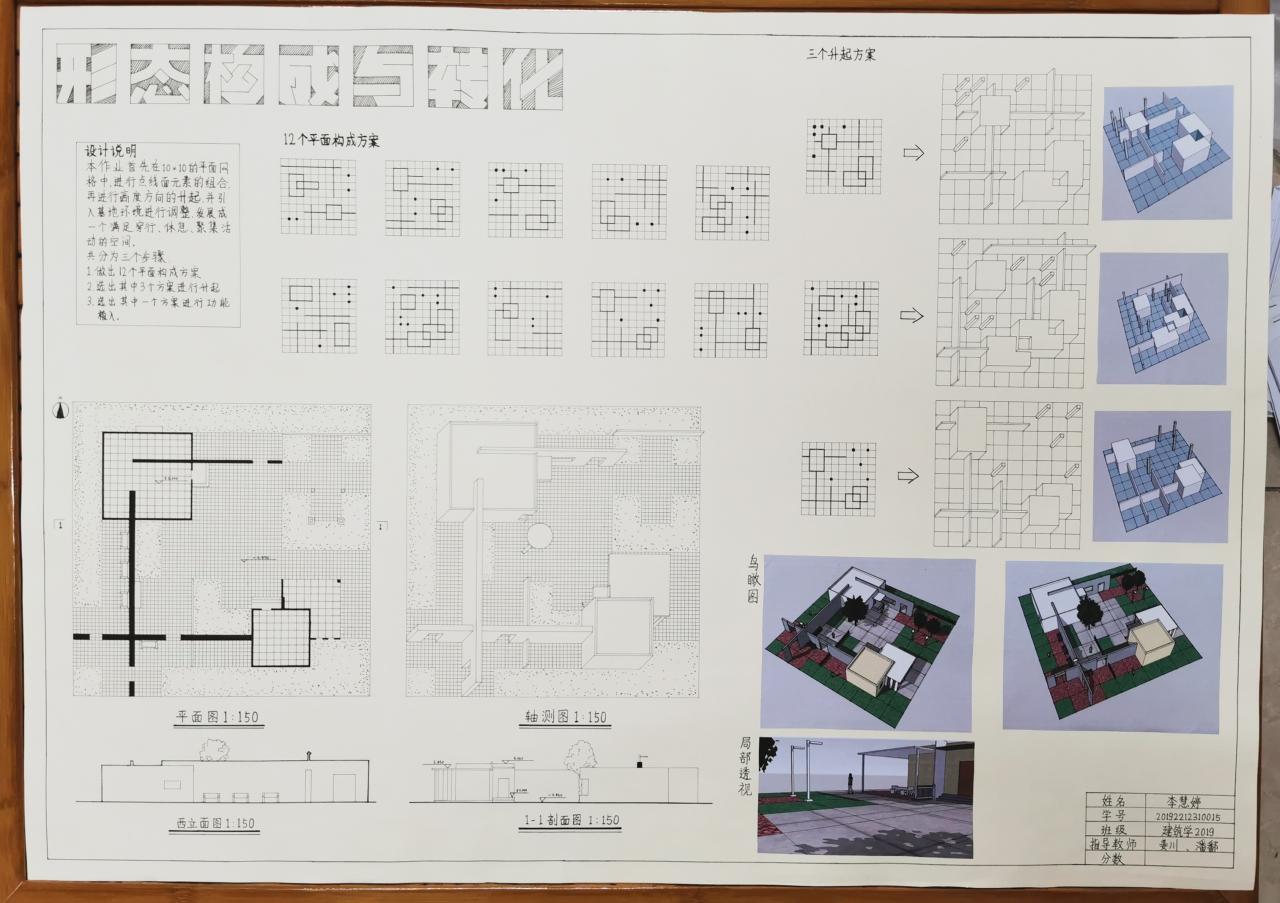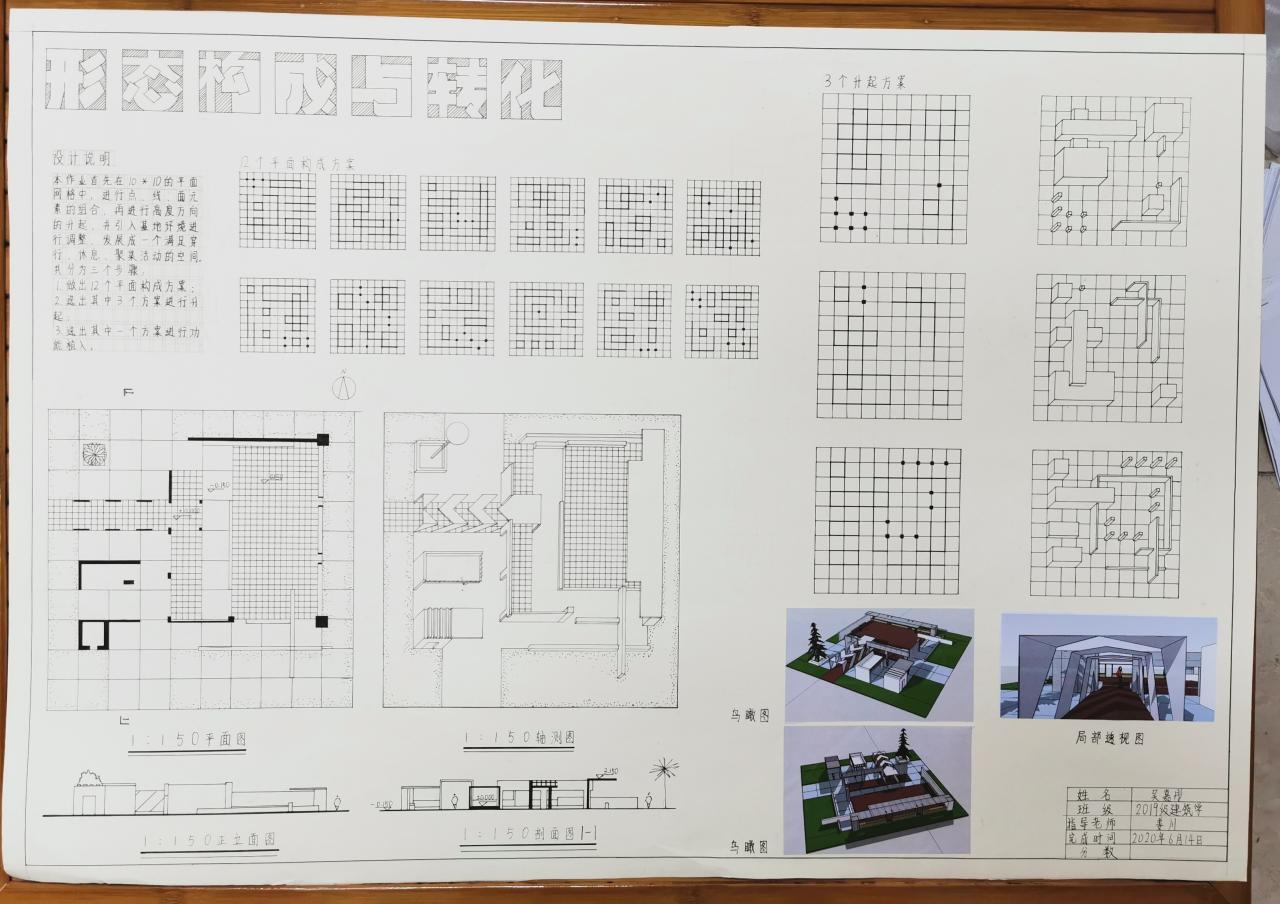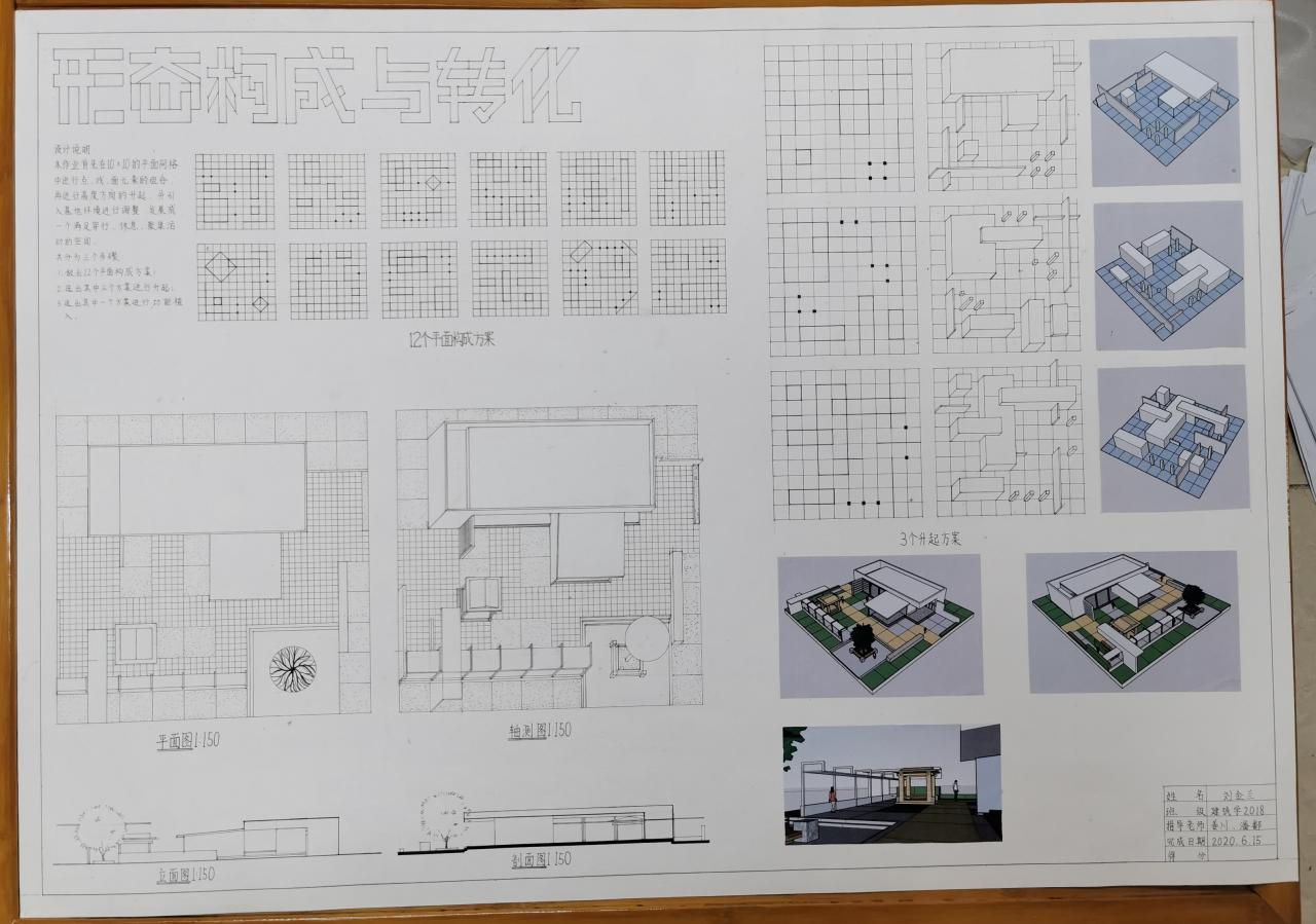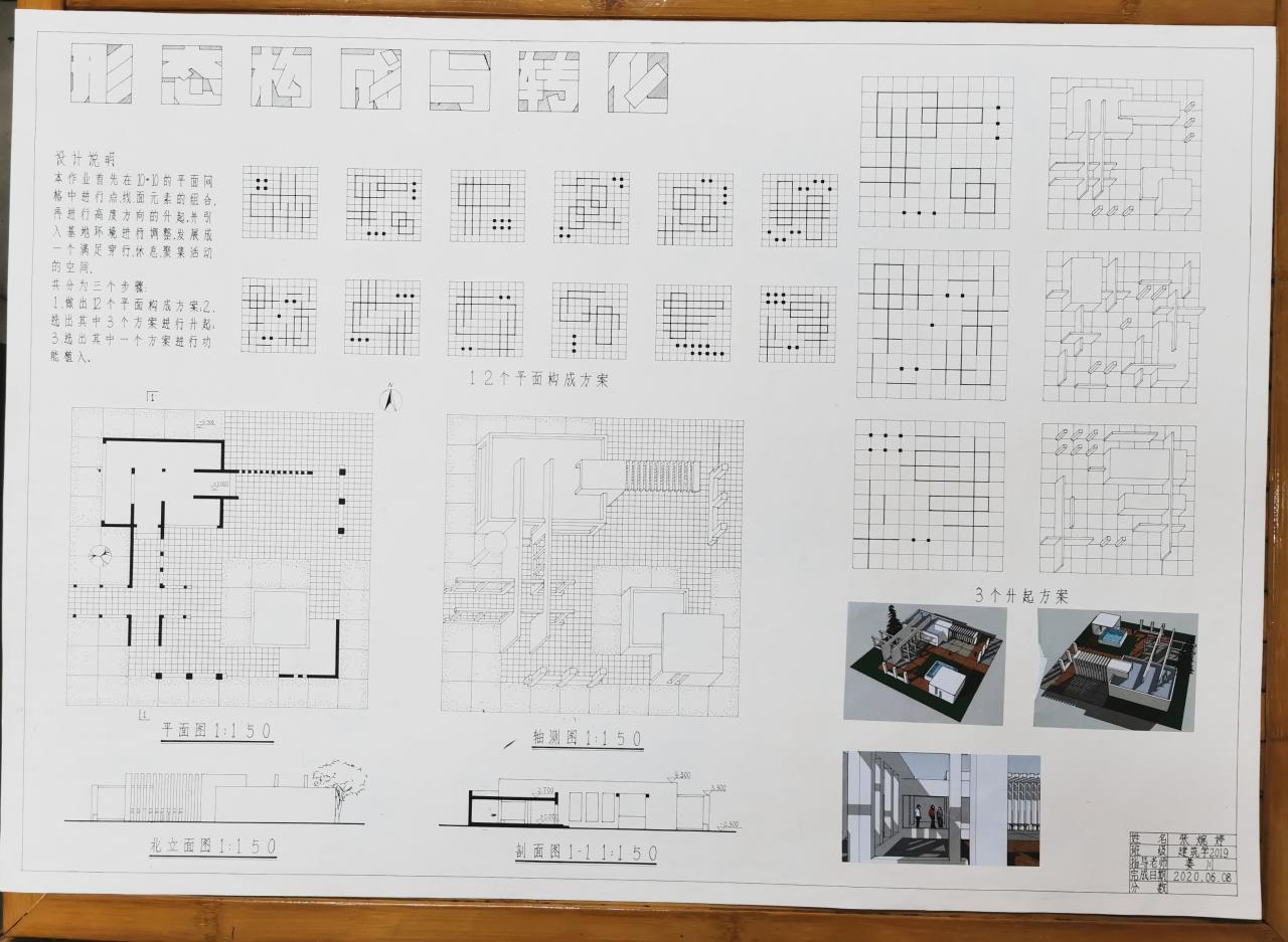 分为三个阶段完成,分别是:平面构成、体的引入、空间设计与构成。先在抽象的网格中进行点线面的组合,然后将点线面进行升起,最后引入基地,环境与功能的限定条件,发展一个既满足人们的活动要求,又具有明确空间形式的构思。