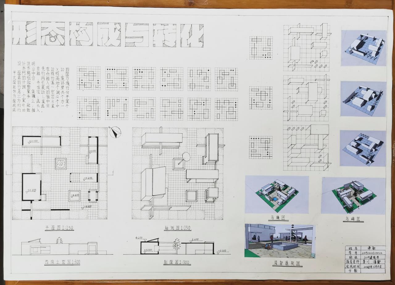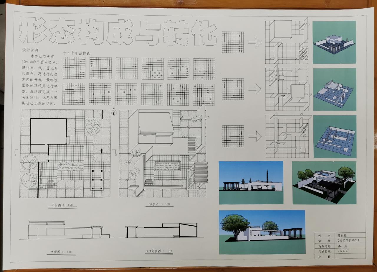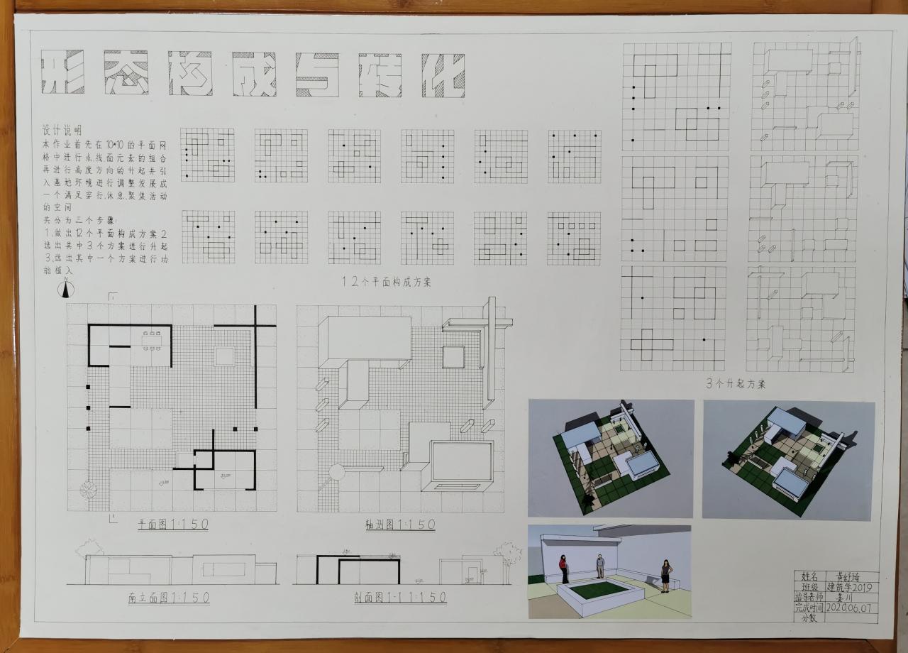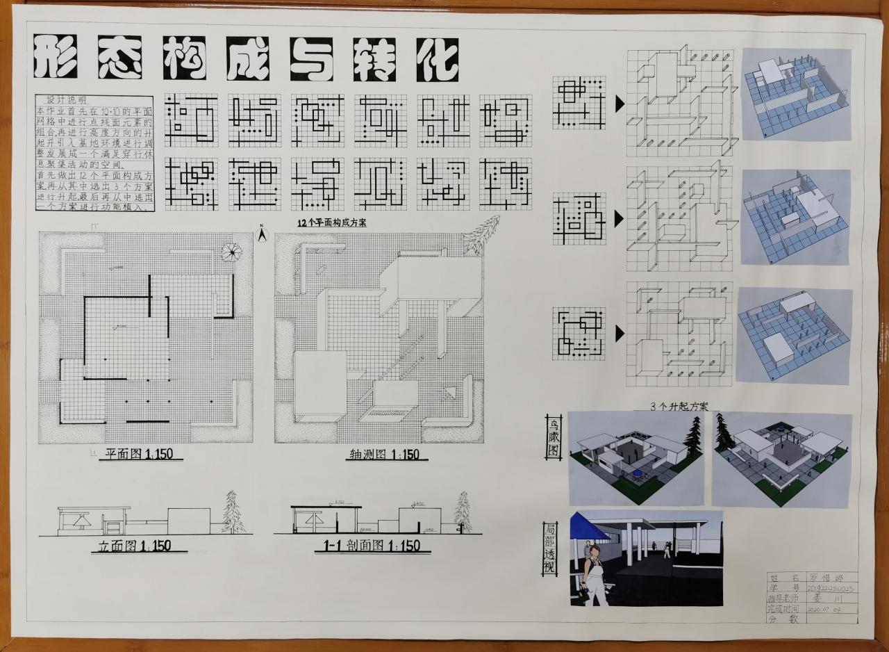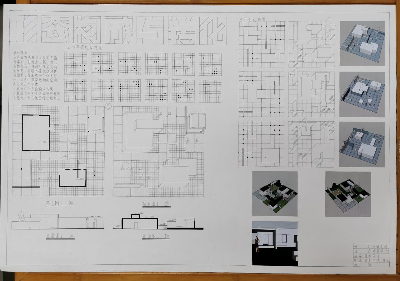 分为三个阶段完成,分别是:平面构成、体的引入、空间设计与构成。先在抽象的网格中进行点线面的组合,然后将点线面进行升起,最后引入基地,环境与功能的限定条件,发展一个既满足人们的活动要求,又具有明确空间形式的构思。