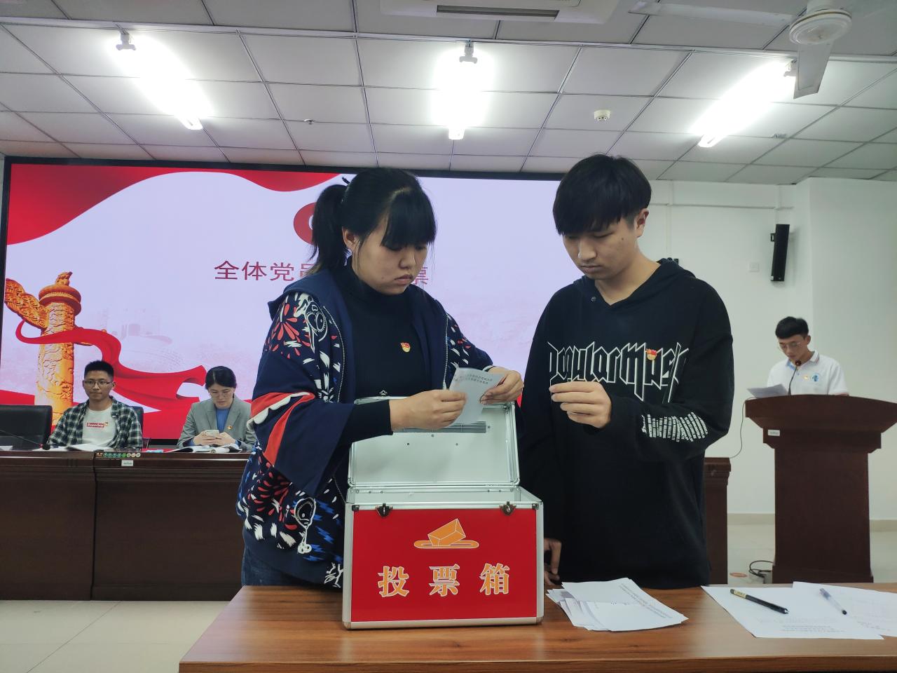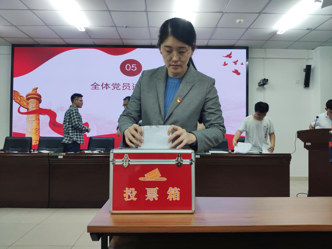 大会第二项内容,投票选举新一届支部委员会。会上通过马续睿、帅博文、白玉、刘孟勇、纪汝昕、唐宇杰、詹达夫(姓氏笔画为序,下同)等7名同志为下届党支部委员会委员候选人。本次表决通过韩广同志为总监票人,贾琳琪同志为监票人,刘子川同志为计票人,刁世科同志为唱票人。经到会有选举权的正式党员匿名投票,最终选举白玉、刘孟勇、纪汝昕、唐宇杰、詹达夫同志为新一届支部委员。经党支部委员会第一次全体会议选举并讨论,确定詹达夫同志担任支部书记,白玉同志担任支部副书记,唐宇杰同志担任组织委员,刘孟勇同志担任宣传委员,纪汝昕同志担任纪检委员。